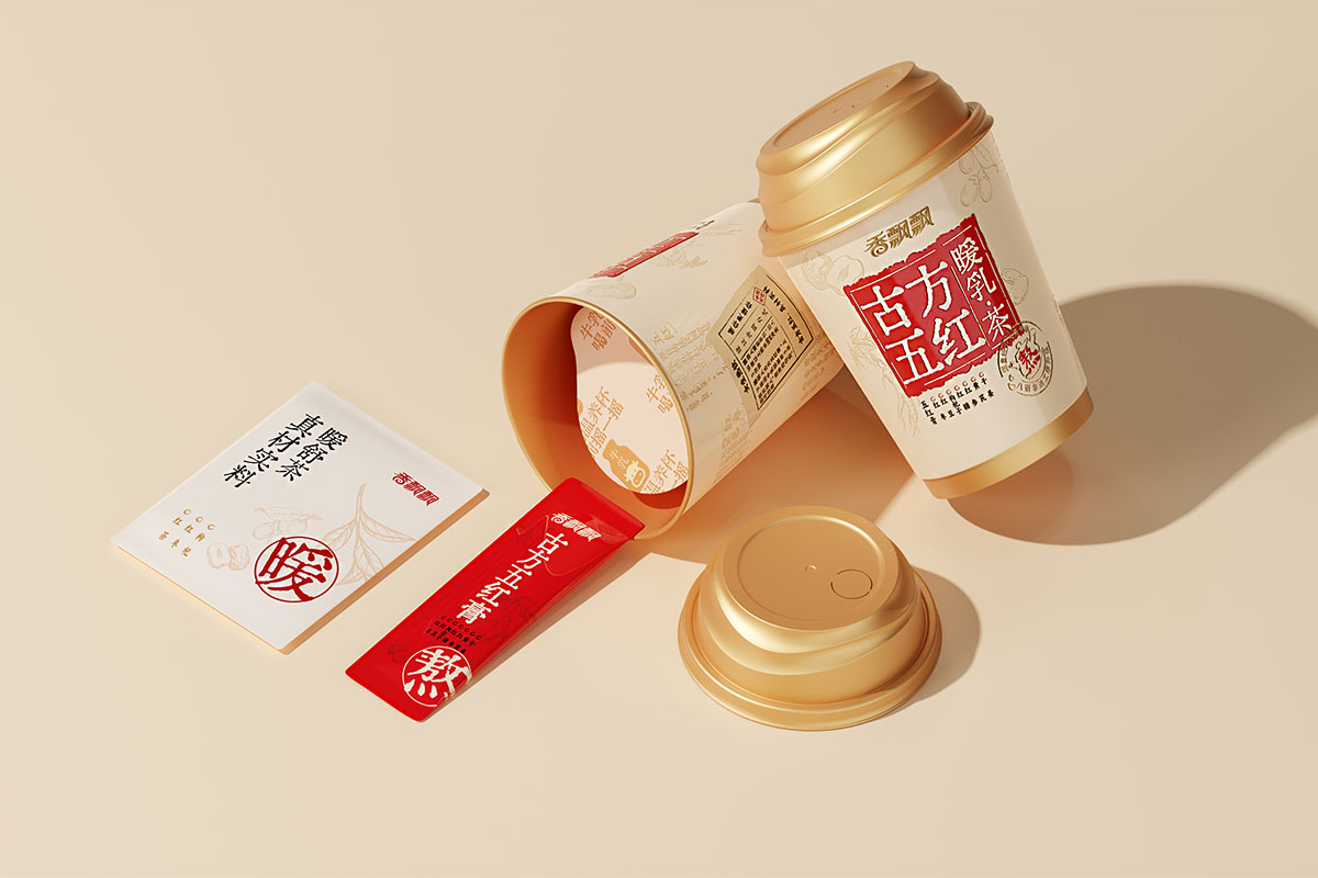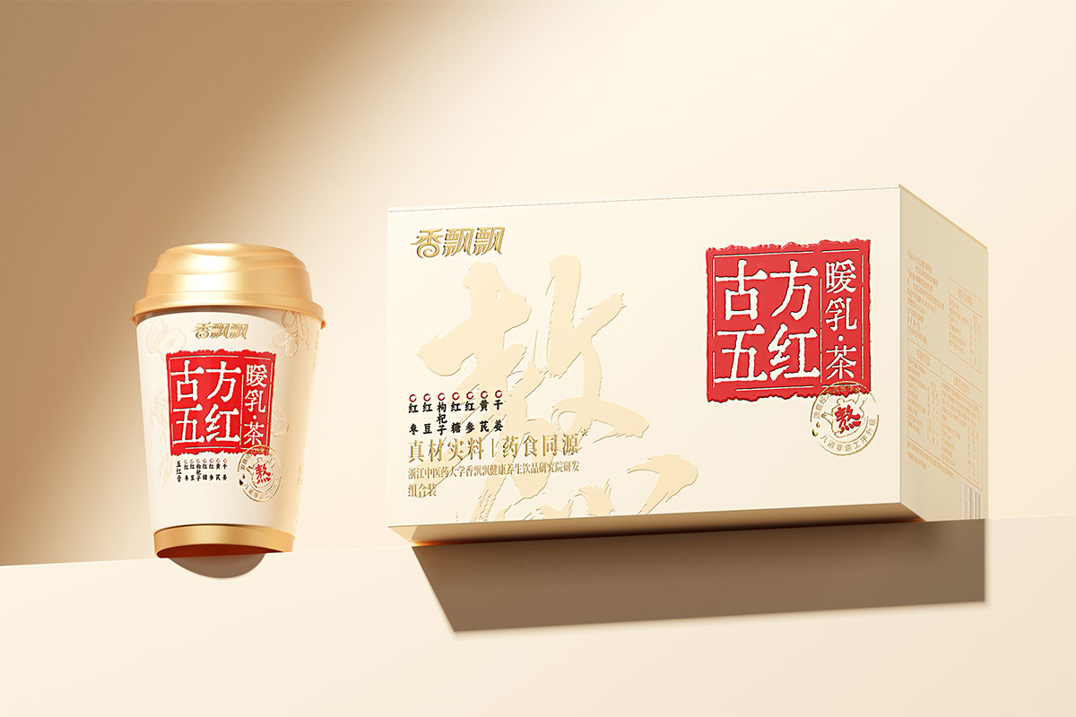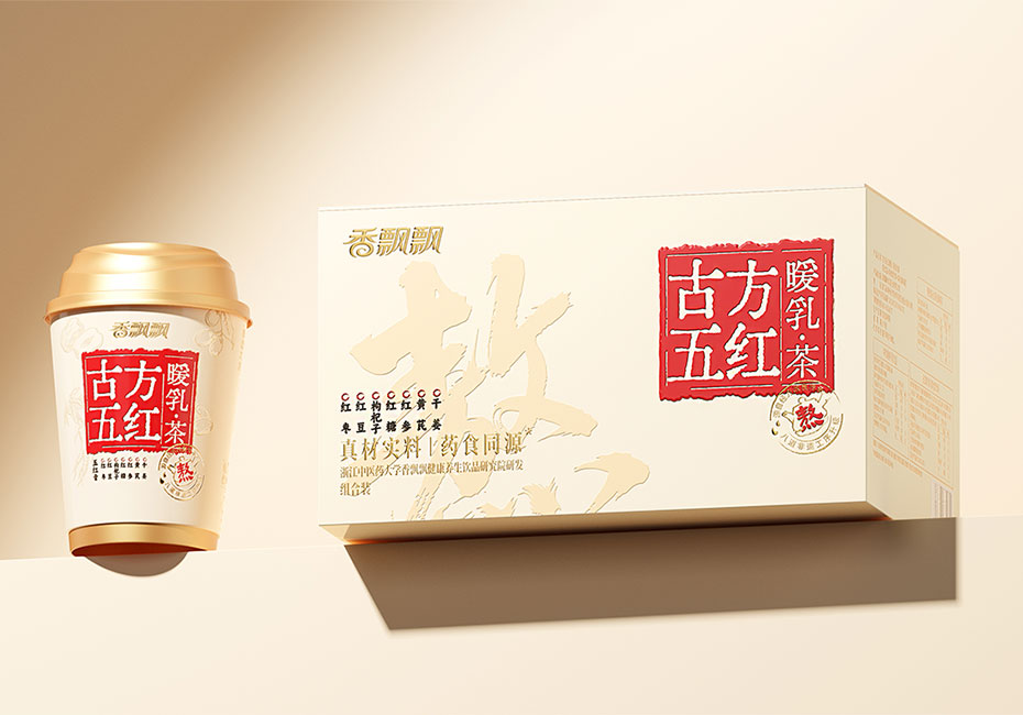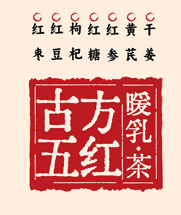 標簽設計融合了“古方箋”與“自然節(jié)律”的意象,以豎排文字列出五紅食材名錄,將五紅食材(紅棗、紅豆、枸杞、紅糖、紅參)與黃芪、干姜等滋補元素以新中式風格重新演繹。